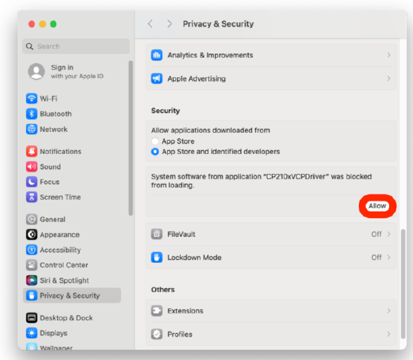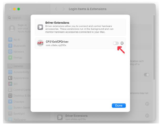 4. Toggle CP210xVCPDriver.app ON